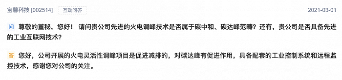 3月1日,宝馨科技(002514.SZ)在深交所互动易平台回复投资者时表示,“公司开展的火电灵活性调峰项目是促进减排的”,股价随即在之后7个交易日内连续上涨,其中3月5日、3月8日涨停,引发深交所向其下发关注函,要求说明是否存在“蹭热点”炒作股价的情形。