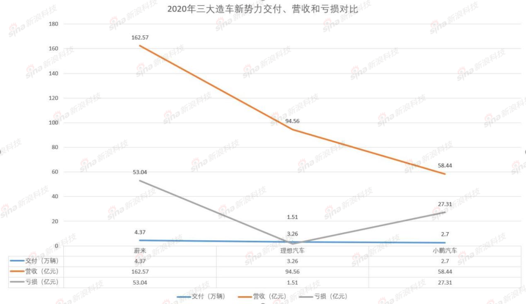 收入规模和交付规模成正比。2020年,威来总收入约162.57亿元,增长约107.77%,净亏损53.04亿元。理想汽车总收入94.56亿元,年净亏损约1.51亿元。第四季度,理想汽车还通过短期理财收益实现盈利。肖鹏汽车年营收约58.44亿元,同比增长151.77%,年净亏损27.31亿元。