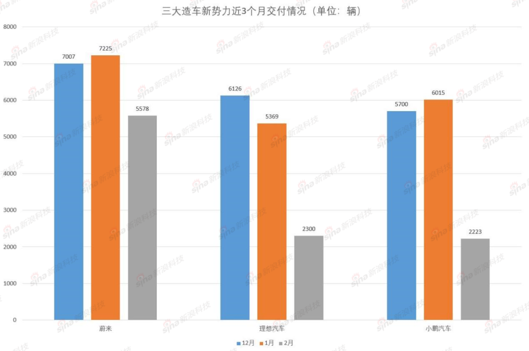 但2021年前两个月,三大新造车势力的交付量都有一定程度的下降。2021年1月,威来交付7225辆,2月交付5578辆;肖鹏汽车1月份交付6015辆,2月份仅交付2223辆;1月交付5369辆理想车,2月交付2300辆。