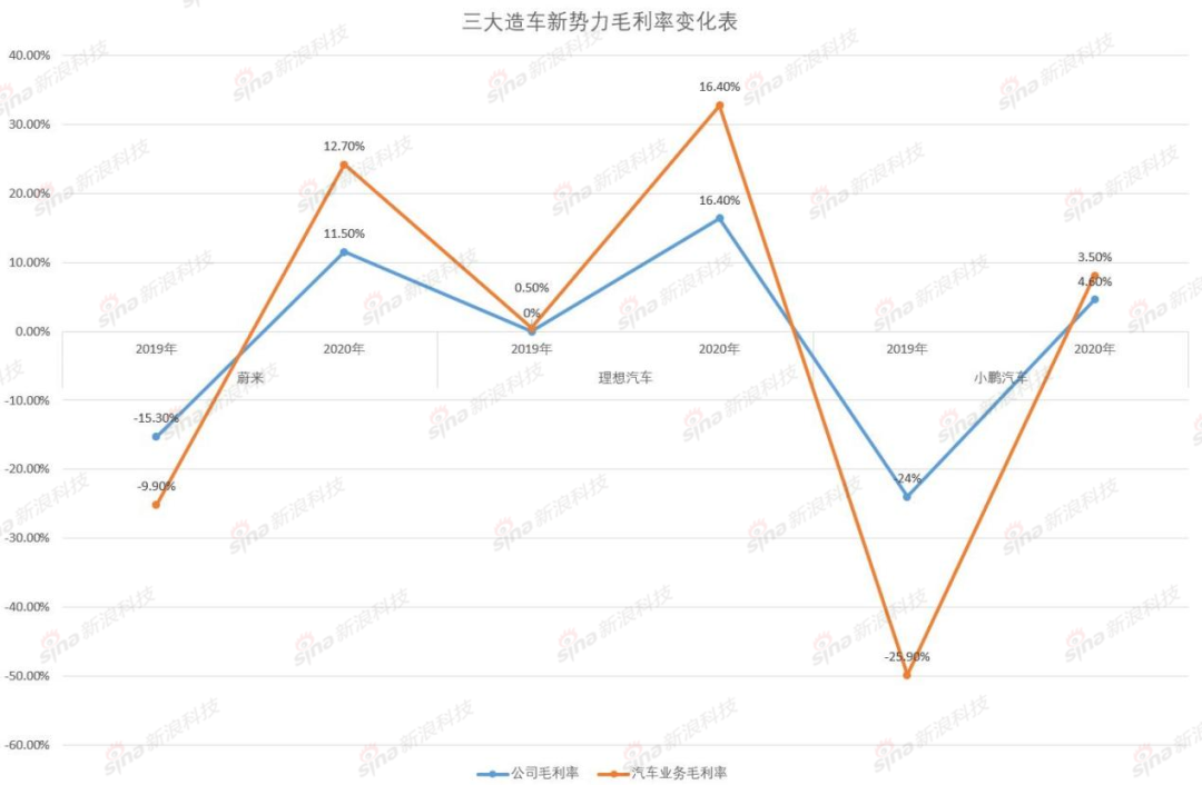 小鹏汽车有过之而无不及。2020年,小鹏汽车的公司毛利率为4.6%,2019年是-24%。汽车业务毛利率为3.5%,2019年是-25.9%。
