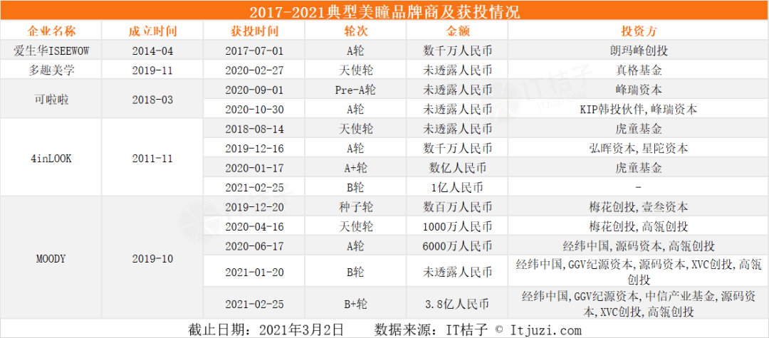 2021年初,化妆品隐形眼镜品牌更是爆发,显示出极大的吸金能力。短短两个月,仅4个投资事件的交易总额就突破5亿元。——化妆品隐形眼镜品牌MOODY率先完成两轮融资,交易金额超过3.8亿元。在此之前,投资者基本上继续跟进。成为化妆品隐形眼镜市场的焦点。此外,化妆品隐形眼镜电商4inLOOK也已完成融资1亿元。
