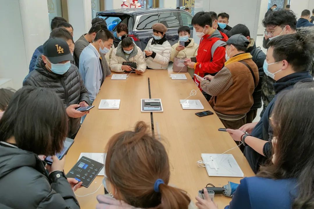 在华为门店体验Mate X2折叠屏手机的顾客人满为患。