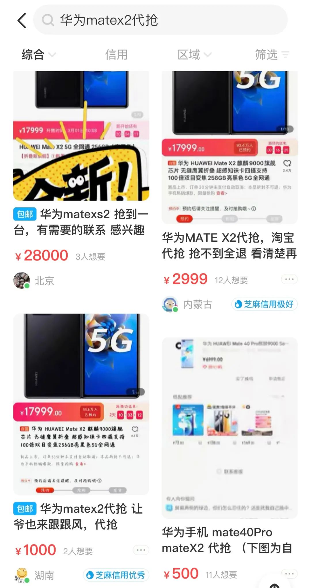 虽然折叠屏手机仍是小众产品,但在闲鱼等平台上,针对Mate X2的高价代拍、出售抢购软件、各种转手交易正十分火热。