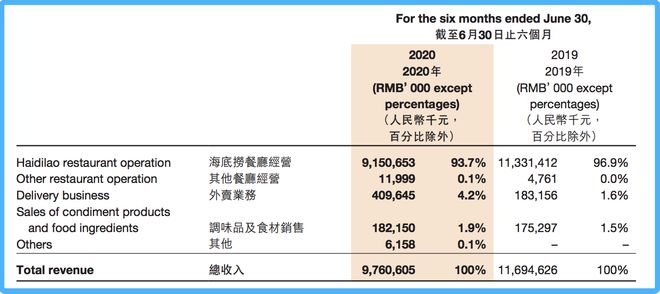根据2020年的年中报告,海底捞的收入分为餐厅运营、其他餐厅运营、外卖业务、调味品和配料销售、其他五个部分。在所有收入中,餐厅的经营收入无疑是最重要的收入来源,2020年上半年贡献总收入的93.7%,达到91.51亿元。