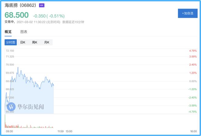 3月2日海底捞港股低开,中途小幅下跌后继续攀升。截至早盘收盘,海底捞报68.5港元,下跌0.51%。