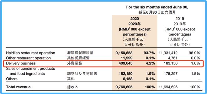 财报显示,2020年上半年外卖订单数量增加,外卖业务收入同比暴涨123.58%,达到4.10亿元,占总收入的比重也从上年同期的1.6%上升到4.2%。就连调味品及食材销售收入占比也有小幅增加,从2019年中的1.5%上升到1.9%。