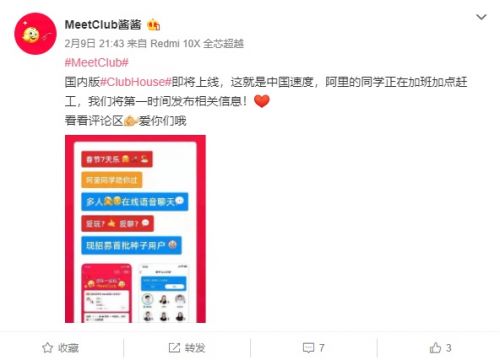 与其他敷衍了事的大制造商不同,阿里的策略是坚持在网上推出独立应用。这次也不例外。2月9日,阿里旗下的Meetclub发出微声,称即将推出中文版的Clubhouse,阿里同学正在加班赶工作。