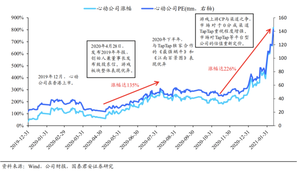 自2021开年以来,心动股价一路飙红,一度突破百元大关,所达市值似乎超过了其所匹配的业绩表现。分析人士表示,二级市场的关注焦点不在心动的游戏业务,而是押注在TapTap上。