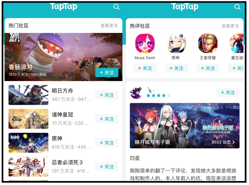 作为手游社区,TapTap选择以 “UGC+PGC”相结合的内容产出方式,为平台用户提供多维度的游戏内容,由此成为了游戏爱好者和泛游戏信息的聚集地,因为也被很多人称之为“游戏界的豆瓣”。TapTap也希望自身由工具型应用向社交型应用转变,以培养质量高、粘性足的用户积极参与游戏相关的讨论。