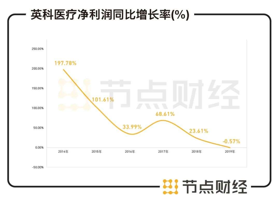但除了短期业绩暴涨之外,盈科医疗的业绩走势开始持续下滑。2014年至2019年,其净利润同比增长率分别为197.78%、101.61%、33.99%、68.61%(上市年)、23.61%和-0.57%。换句话说,到2019年,盈科医疗净利润同比出现负增长。从2014年开始,增速下降了300多倍。