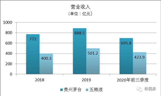 从营收规模上,贵州茅台(2497.030,-103.97,-4.00%)2018、2019和2020年前三季度的营业收入分别是772亿元、888.5亿元和695.8亿元;而五粮液同期的营业收入则分别是400.3亿元、501.2亿元和423.9亿元,营收规模相差甚远。