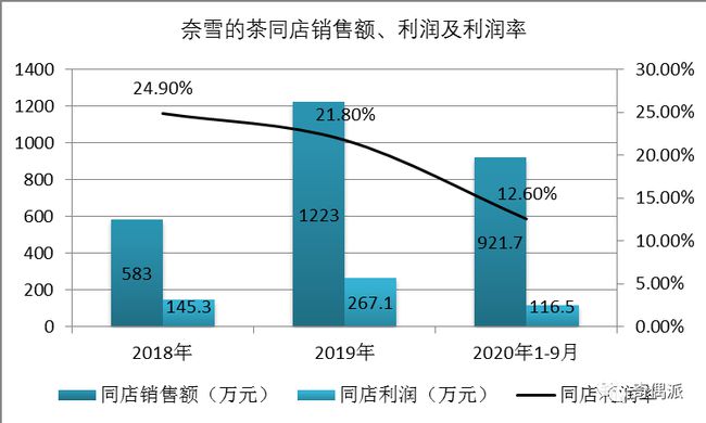 奈雪2018年同店销售额总计583万元,同店利润145.3万元,同店利润率24.9%。到了2019年,奈雪同店销售额总计达到1223万元,同店利润达到267.1万元,但是同店利润率下滑到21.8%。而至2020年前三季度,奈雪同店销售额总计921.7万元,利润116.5万元,同店利润率仅为12.6%。