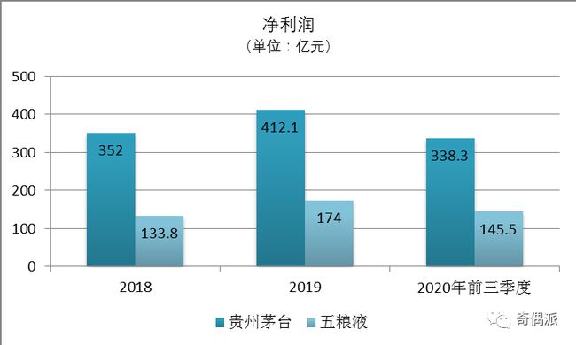 由于稀缺性和龙头公司定价权的差异,五粮液公司的净利润与贵州茅台的净利润相差要远大于营收的差距。五粮液在2018、2019和2020年前三季度的净利润分别是133.8亿元、174亿元和145.5亿元;而同期贵州茅台的净利润则分别是352亿元、412.1亿元和338.3亿元。