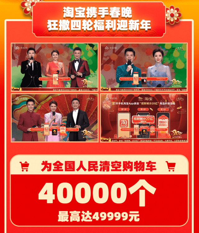 作为春晚的独家电商合作伙伴,淘宝已经进行了四轮清空购物车的活动,在除夕夜共有4万人成为幸运儿。其他红包主要是以购物补贴的形式发放,核心是淘宝的买菜补贴,可以收到多个优惠券,共计100元。