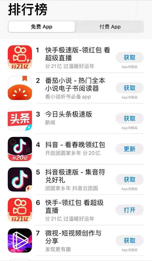 在春晚结束后的Applestore最新榜单,撒了几十亿红包的互联网巨头几家欢喜几家忧,快手登上榜单第一,除了短视频和阅读软件,其他几家撒钱的平台几乎看不到身影,可见用户在春节的注意力,也并不是用钱就能买定的。