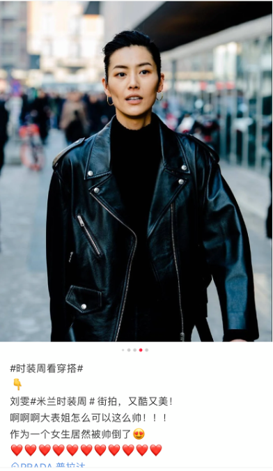 2019年意大利米兰初春,走进试衣间的中国模特刘雯,正准备展示一件带有黄色图案的普拉达连衣裙,却被拍到穿着同品牌的黑色摩托车夹克在街上行走。照片中的刘雯英俊潇洒。