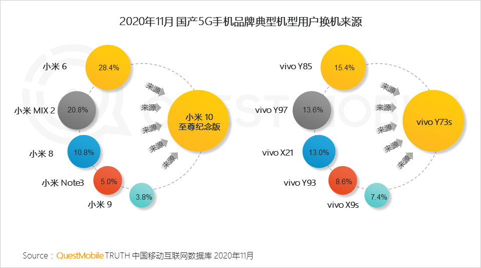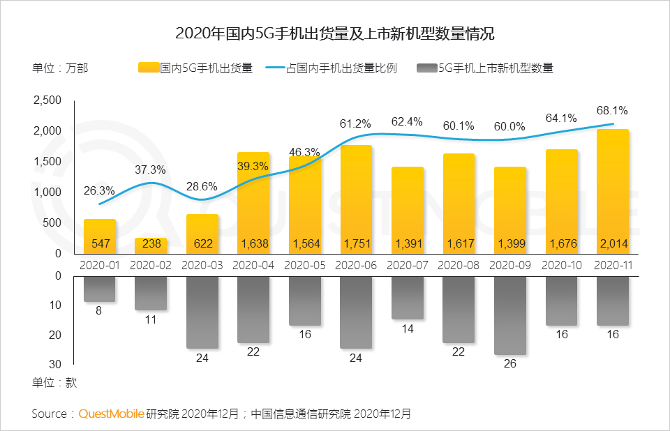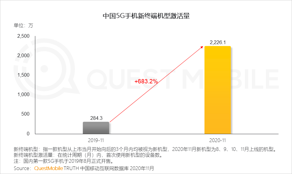 2020年,各大厂商都推出了5G手机时代的5G智能机型。11月份,新车型激活数量达到2226万辆。新一代手机替代正在推动消费市场和用户价值差异化的探索。