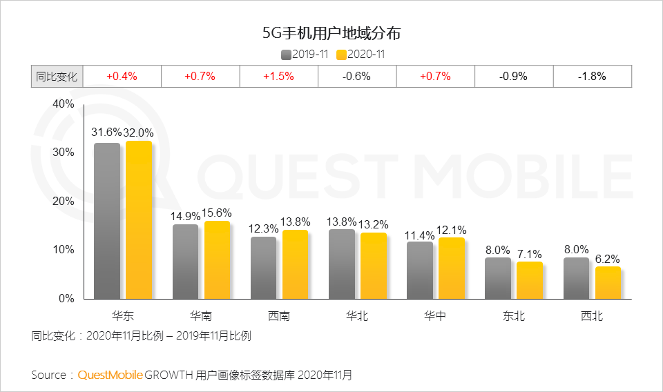 4.从地理分布来看,华东是5G手机的主要用户市场,南方市场增长迅速,与区域经济活动高度相关
