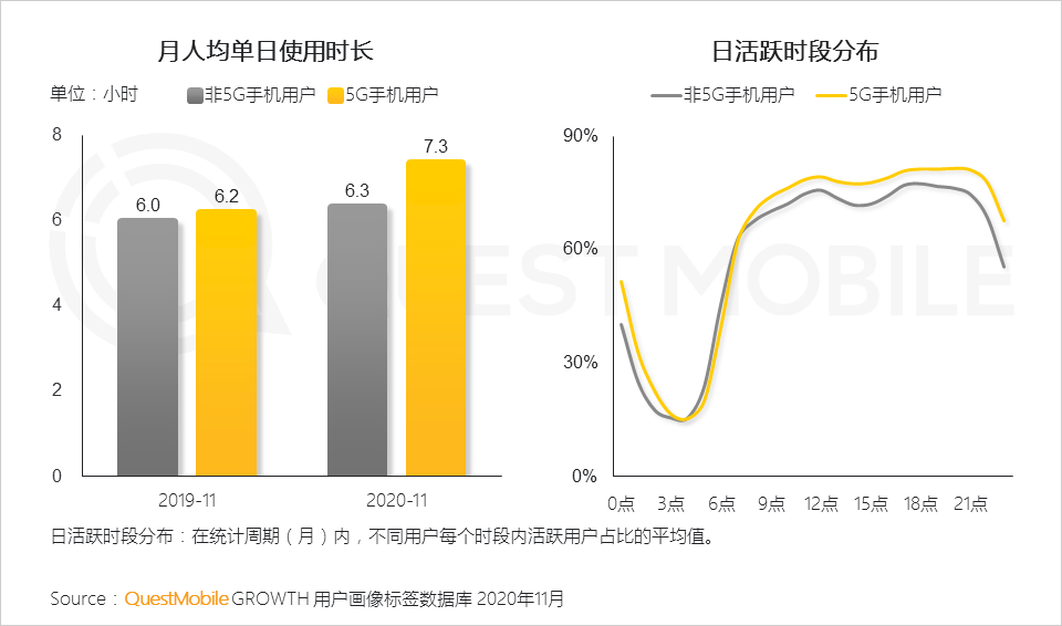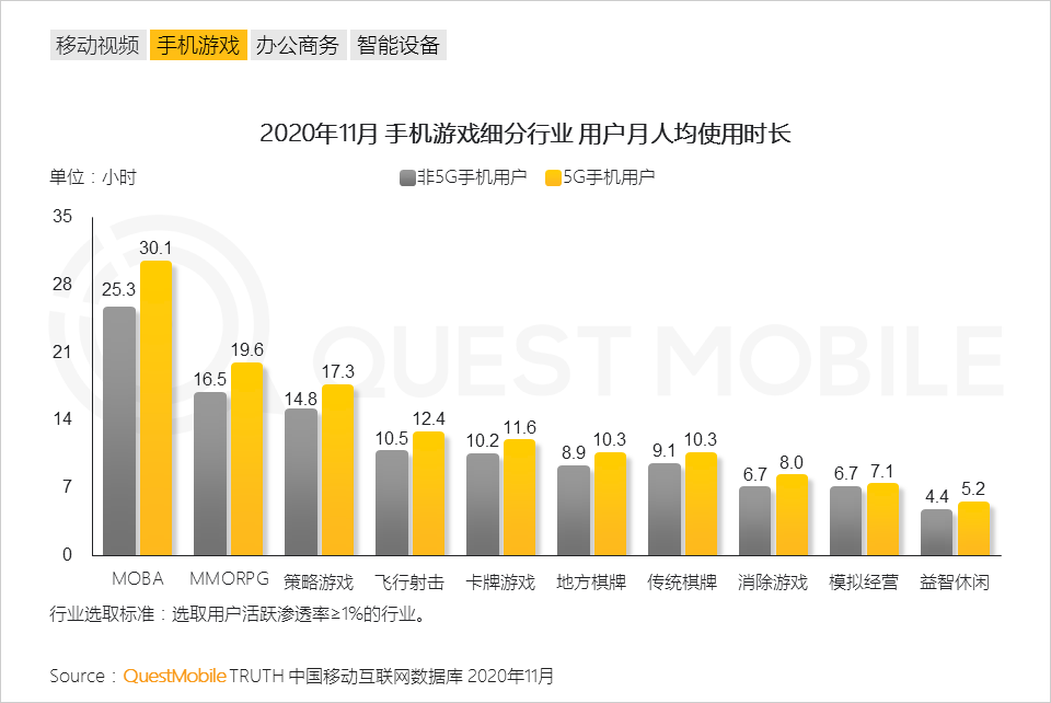 5.5G手机同时也会给用户带来更强的游戏体验。用户的游戏使用时间高于非5G手机用户,5G将为手机游戏市场带来新的发展机遇