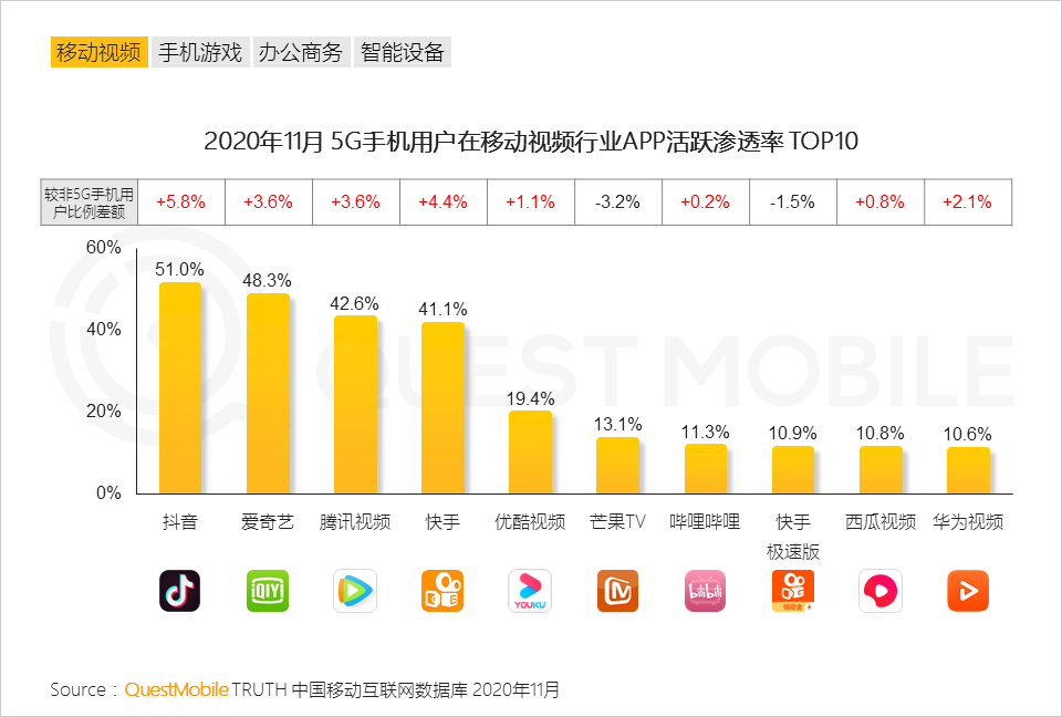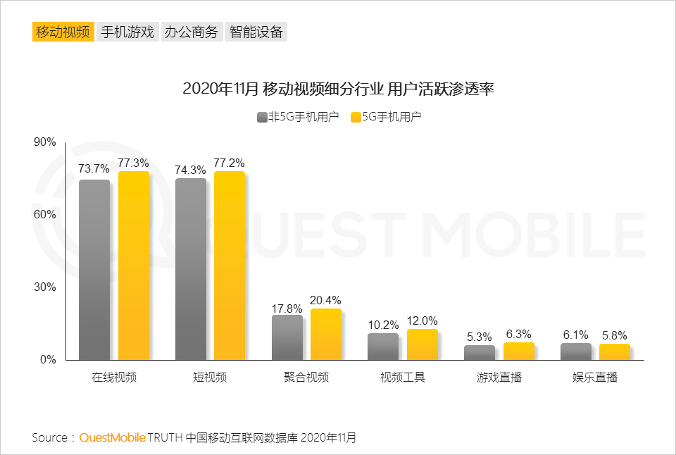 4.5G手机用户在移动视频行业的用户集中度相对更明显,头部APP的普及率相对更高。5G带来的观看体验进一步加强了他们的使用粘性