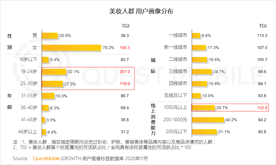1.美容群体以30岁以下的年轻女性为主,在线消费能力高,促进了美容消费的繁荣