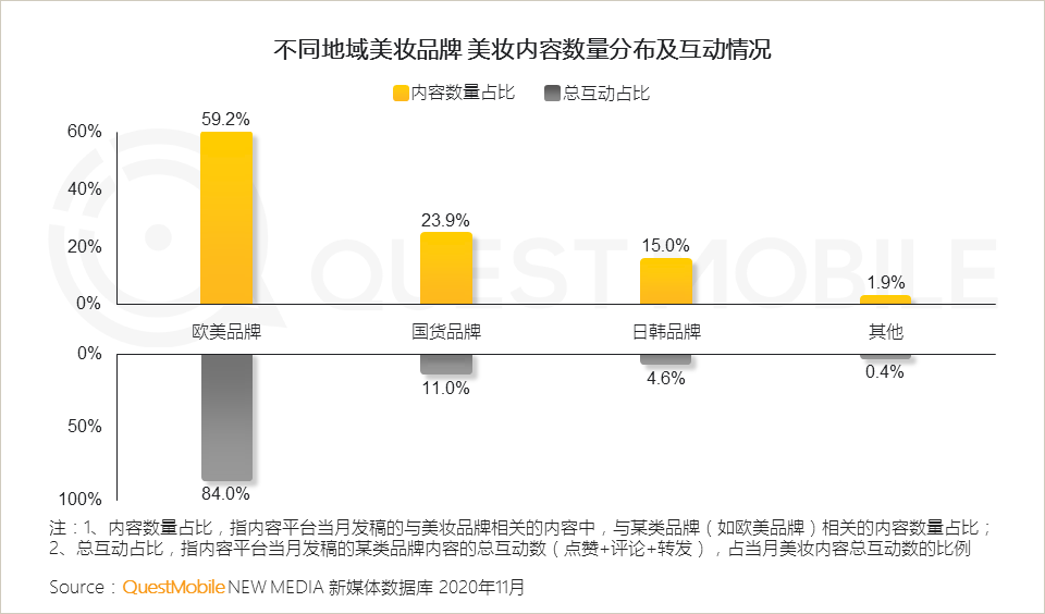 品牌KOL内容营销中,欧美品牌在数量与互动量中均占据优势