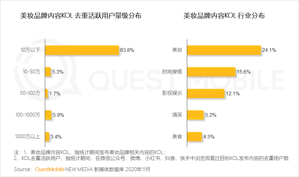2.活跃用户不到10万的中长尾KOL已经成为品牌营销的主力军。除了美容服,影视、搞笑、美食KOL也在推广美容产品