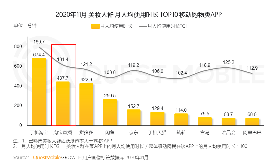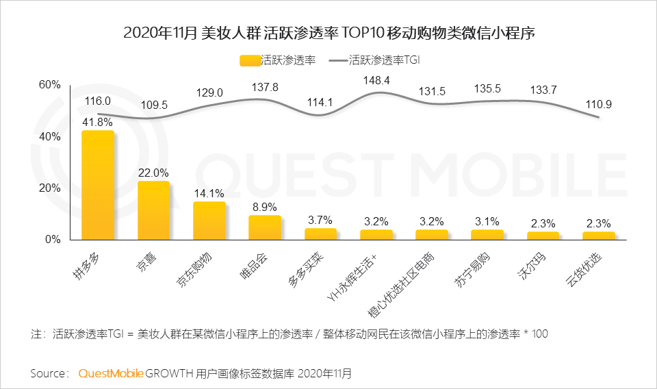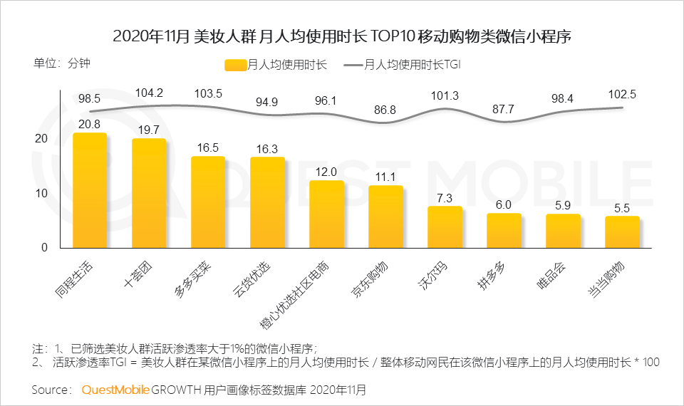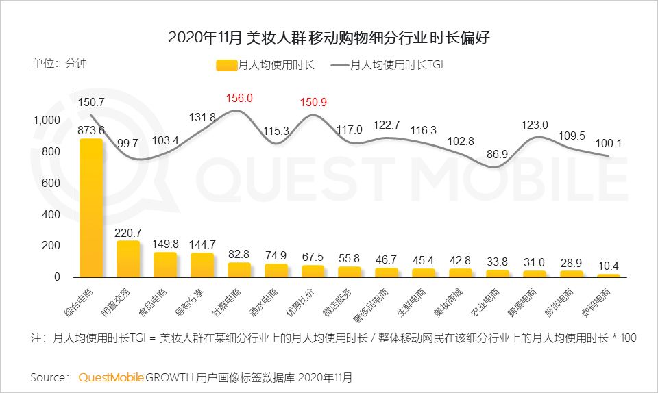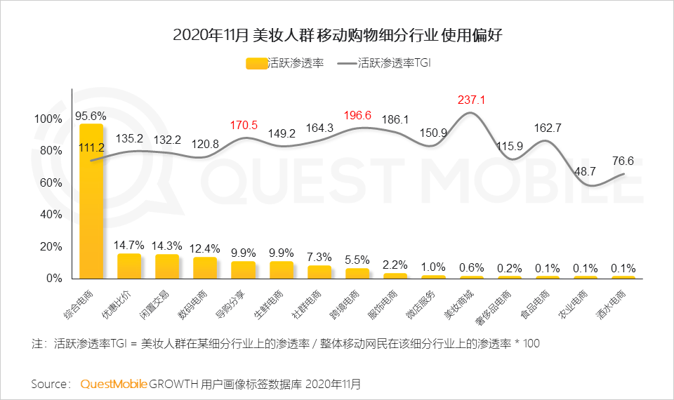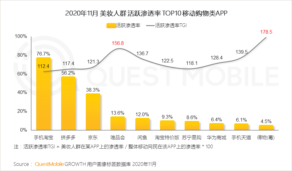 4.美容人士在各种购物应用中的TGI高于大规模用户,表现出较强的购买力,其中对拿东西(毒)和Vipshop的偏好更为明显