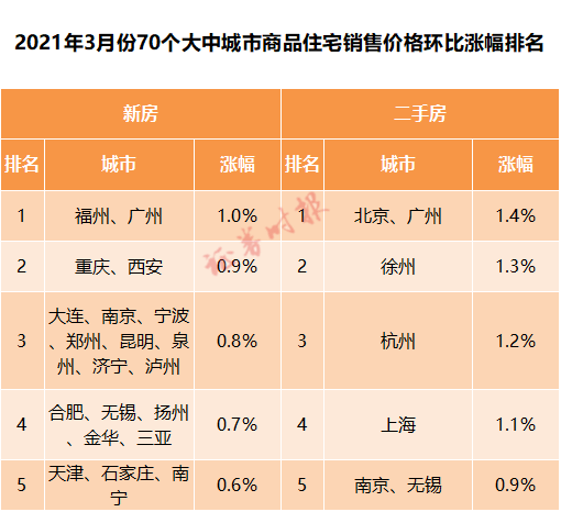 4月16日,国家统计局发布了2021年3月70个大中城市商品房销售价格变动情况。最新数据显示,3月份各城市商品房销售价格环比涨幅与上月相比变化不大,同比涨幅继续上升。其中福州、广州新房价格领涨全国,广州、北京二手房价格领涨全国。
