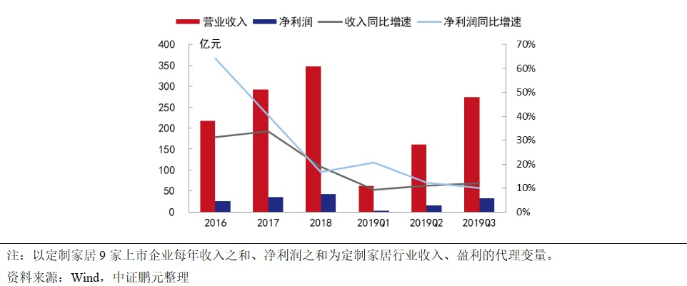 根据沪深鹏远的评级,2018年行业收入增长率约为19.00%,三年来首次低于30%。如果只使用定制家居上市公司的数据,结果更明显。2017年,9个定制行业上市公司的平均收入增长率为33.15%,2018年至2019年,这一数据分别为17.94%和16.24%。