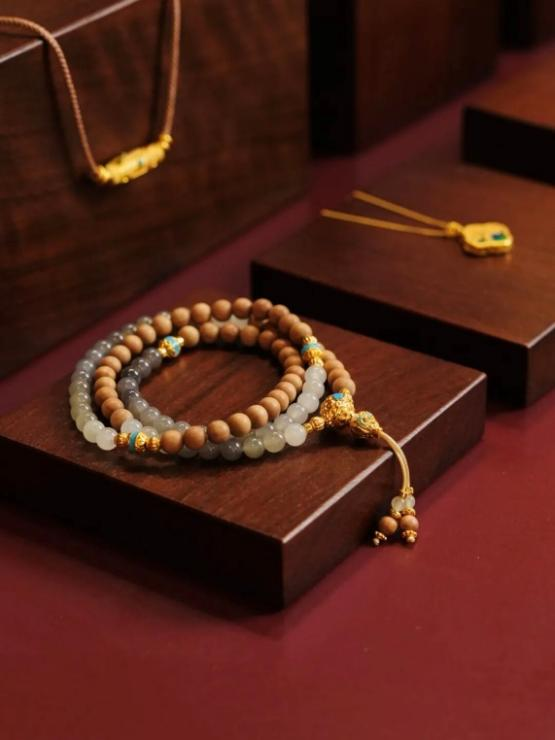 最后,是串珠品类的东西方演绎。一边是强调把玩与寓意的黄金文玩串珠,一边是更偏向搭配与个性表达的腕美转运珠。两种佩戴方式在同一生活方式场景中被演绎,让串珠从“单一功能型饰品”,延展为可以自由组合、反复佩戴的日常选择。