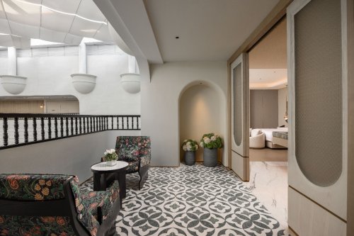 设计的精髓,在于对“融合”一词的深刻实践。所谓“东意”,根植于蕲春作为“园林古城”与“中草药之乡”的千年文脉。设计师从传统园林的“亭、桥、院、阁”中汲取灵感,在整个空间中巧妙运用序列式拱廊与框景手法。从首层落客区开始,宾客便经历一场富有仪式感的旅程:经由三重不同尺度的门序(从宏大的建筑尺度过渡至私密的人体尺度),结合入口花房与百叶屏风的层层引导,心境随之从喧嚣都市步入静谧园林。这一过程,完美复现了古典园林“移步换景、渐入佳境”的审美趣味。