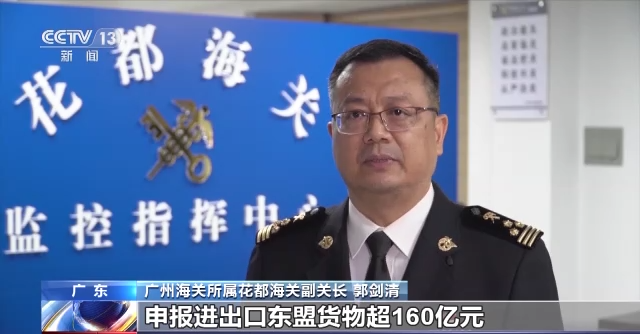 广州海关所属花都海关副关长 郭剑清:广州花都口岸申报进出口东盟货物超160亿元,海关着力优化口岸营商环境,推动通关便利化改革,“一企一策”精准帮扶制造型企业提升自主品牌影响力和竞争力,推动对外贸易呈现稳中向好态势。