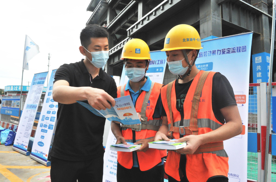 北京市人力资源和社会保障局、丰台区人力资源和社会保障局共同走进国家金融信息大厦工程项目工地,进行工伤保险政策宣传。