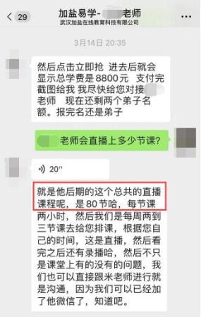 最近她对国学很感兴趣。她在武汉听了四节免费的加盐直播课,感觉氛围不错。她喜欢直播课,学生可以和老师互动,老师说话更有感染力。她问销售人员直播课有多少节,对方说有80节,一周两到三节,可以看录播。今年3月,她花了8800元报读了《盐》国学大讲堂。