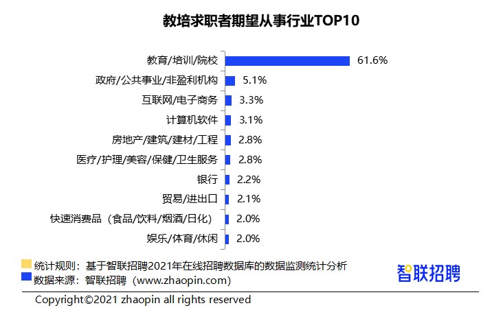 根据智联招聘平台的大数据显示,一线城市的城市级别降幅最大。2021年7月,一线城市教育培训行业发文量较3月下降38.2%,高于其他城市。电子商务(3.3%)、计算机软件(3.1%)和房地产(2.8%)也是一些人的职业选择。