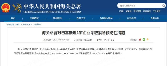 由于从巴基斯坦进口的一批冷冻金线鱼的一个外包装样本中新冠肺炎核酸呈阳性,根据海关总署公告第103号的规定,国家海关将从即日起暂停巴基斯坦水产品生产商M/S MARITIME fish(注册号T-445/2004)的进口申报4周。