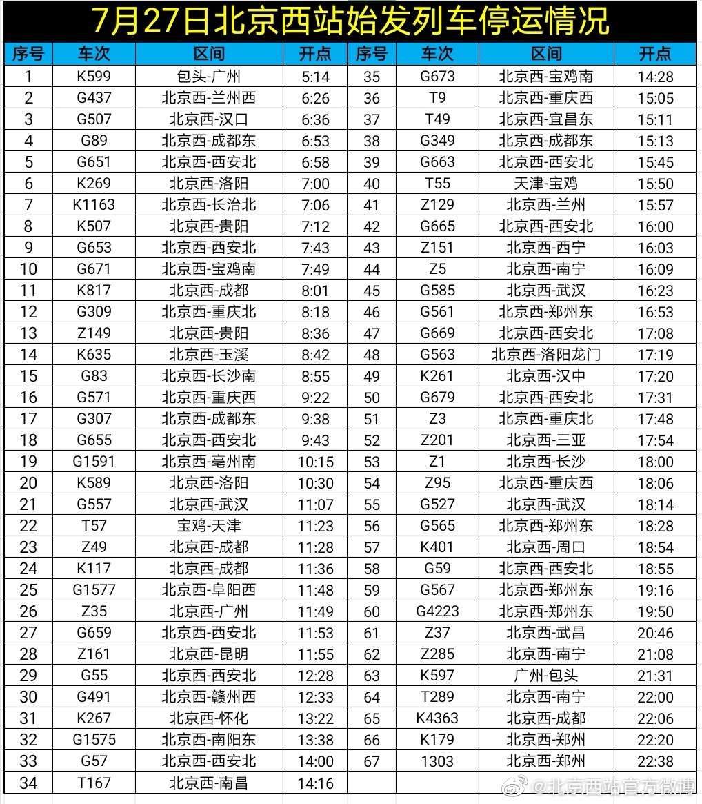 据北京西站官方微博消息,由于河南省多处持续强降雨,北京西站67列发车列车于7月27日停运。