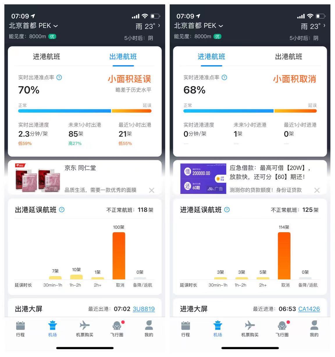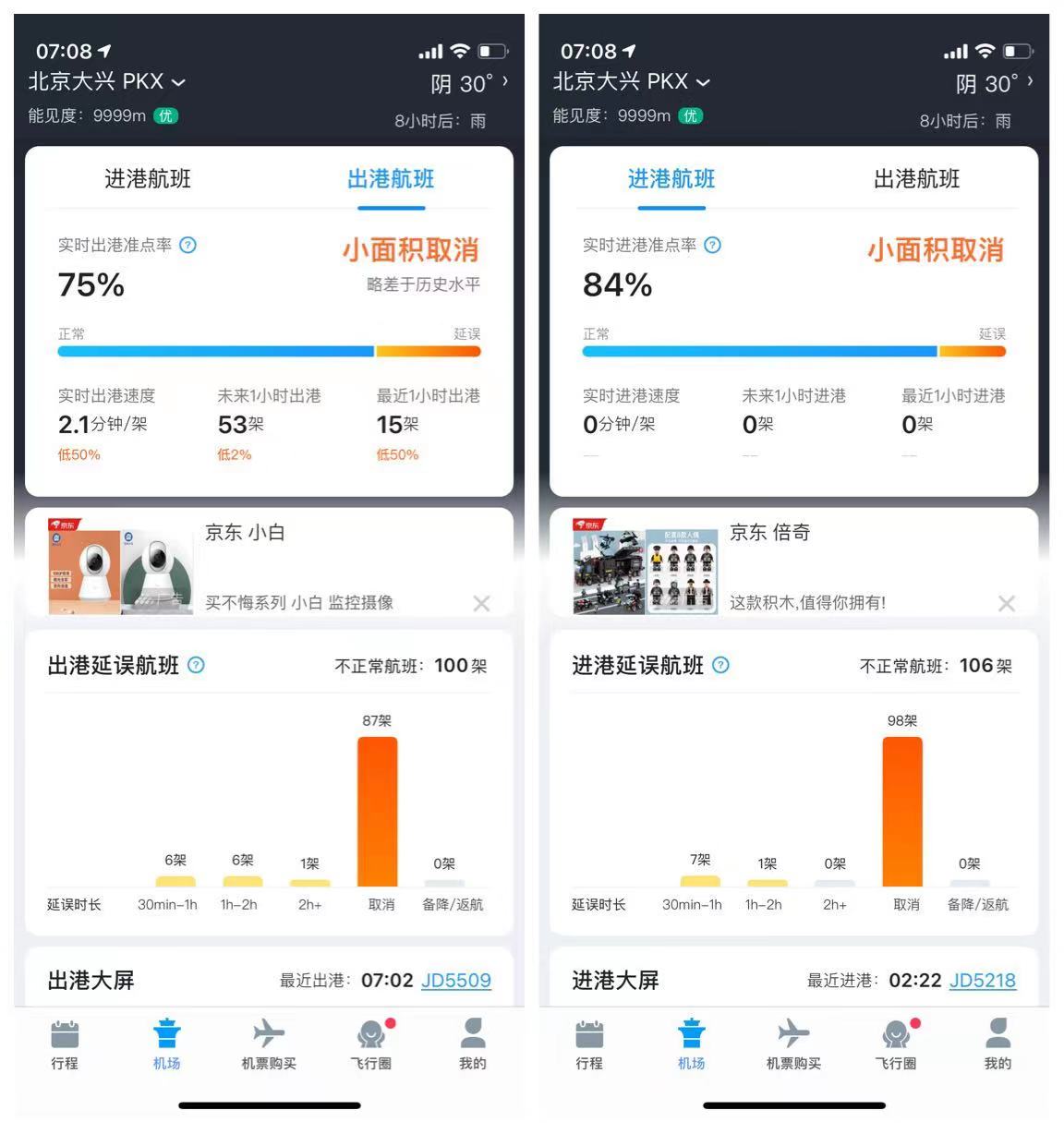 至于北京大兴国际机场,据费长俊APP数据显示,截至27日7时08分,北京大兴国际机场进出港航班出现小幅延误,共取消航班185架次。