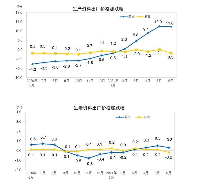 7月9日据国家统计局网站消息,2021年6月,全国工业生产者出厂价格同比增长8.8%,环比增长0.3%;工业生产者购进价格同比上涨13.1%,环比上涨0.8%。上半年工业生产者出厂价格同比增长5.1%,工业生产者购进价格同比增长7.1%。