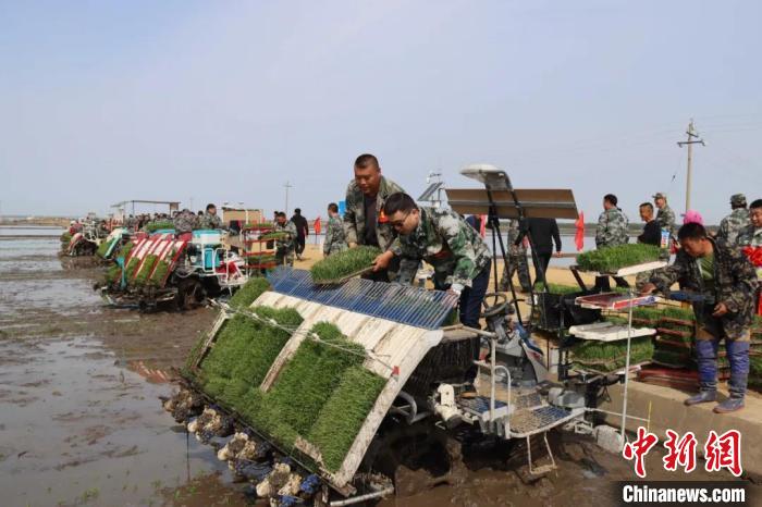 5月8日电 在一排插秧机之后,绿色的秧苗覆盖了整个田地.5月7日,北大荒集团建三江分公司859农场稻田成立插秧大赛。来自14个行政区的28名选手在闪闪发光的稻田里参加现代水稻移植比赛。