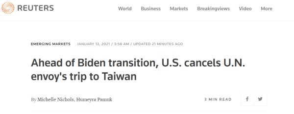 路透社说,克拉夫特的台湾行似乎是特朗普政府在拜登就职前对中国采取强硬态度的又一努力。中方曾表示坚决反对此次访问。