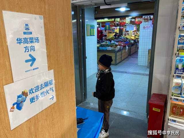 盒马还在传统菜市场区之间开了一扇双门,并在门的柱子上贴了两个标志:“欢迎来到高华菜市场——方向的隔壁,更多的烟花”,文字旁边画了一个满载的盒马娃娃。