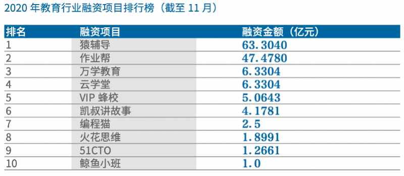 2020年1月,莱斯网络学校完成了8000万美元的A轮融资;2月,凯叔讲了一个故事,完成6600万美元的C轮融资;3月份辅导完成了10亿美元的G轮融资;6月份,作业帮完成了7.5亿美元的E轮融资;9月,校长教育完成新一轮融资超过4亿美元;10月,猿类辅导完成