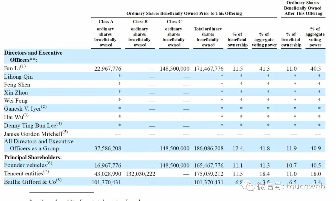 发行后,李斌持有11%的股份,拥有40.5%的投票权;腾讯持股11%,拥有18%的投票权;贝利吉福德公司持有6.5%的股份,拥有3.4%的投票权。