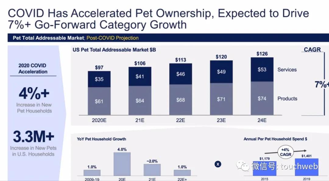 美国宠物行业,包括宠物食品、宠物产品、医疗服务和非医疗服务,是一个不断增长的市场。国内的宠物企业或者宠物电商公司相对于Petco或者Chewy要小很多,中国的宠物市场比较分散,任忠发展的路还很长。