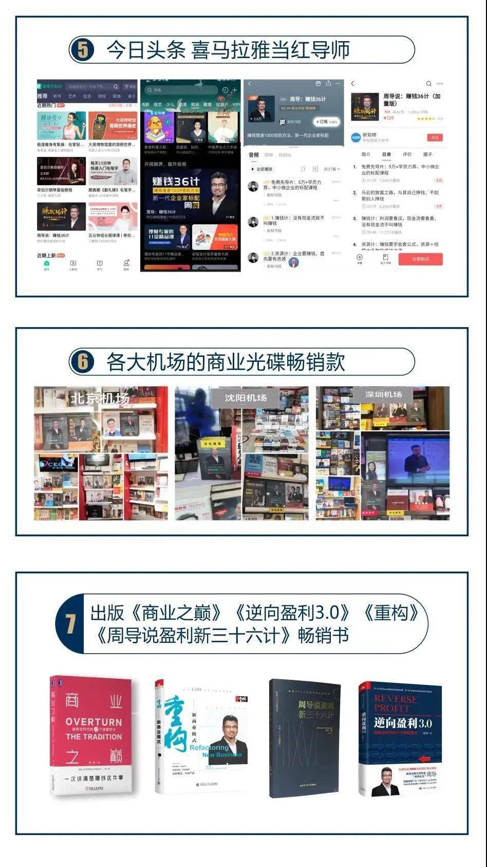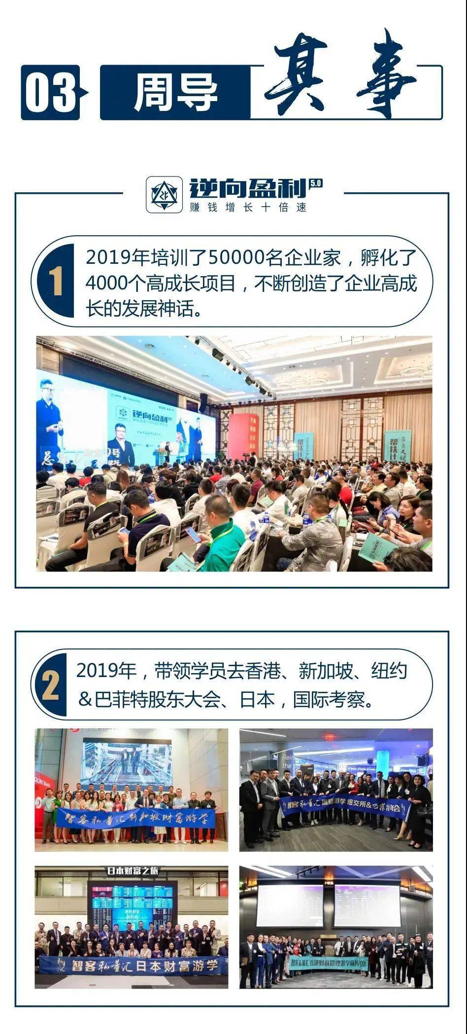他还组织了很多培训班,每次都有成千上万的人参加。参加完每周一次的讲座,很多同学也从亏损转为盈利,盈利指数上升。有意思的是,有个学生听了周导的《逆向盈利》,去跟全聚德老板谈合作。结果成功了!而且这个学生决心把全聚德扩大到500亿的市值!