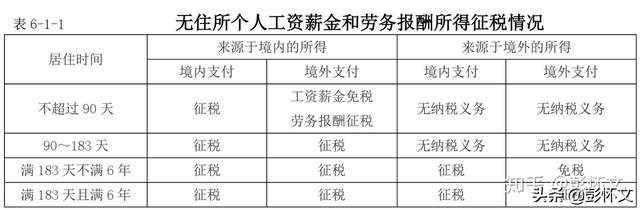 1.无住所的个人在一个纳税年度内在中国境内累计居住满183天的,此前六年在中国境内累计居住满183天且在任何一年内未离境超过30天的,该纳税年度内来自中国境内外的所得,应缴纳个人所得税;此前六年在中国境内居住不满183天或者一次离境超过30天的,该纳税年度境外单位或者个人的所得免征个人所得税。