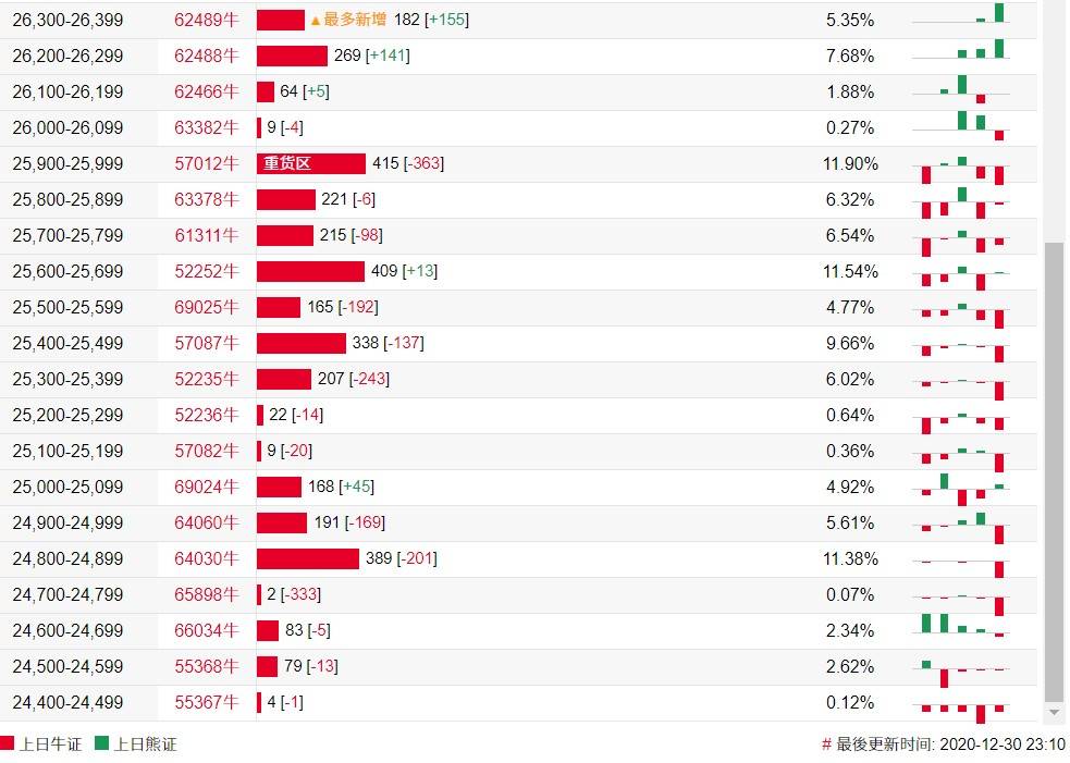 根据法兴智恒牛雄街货物分布图中的数据,郑雄街的重货区在27300-27399范围内,该范围内最新的熊证数量为1363张,比上一交易日增加281张;最多是在27400-27499区间内新增,该区间内的最新空头凭证数量为1086张,较前一交易日增加451张。牛正街重货区在25900-25999区间,该区间最新牛证数量为415张,比前一交易日减少363张。最多在26300-26399范围内添加。该区间最新牛证数量为182张,较前一交易日增加155张。