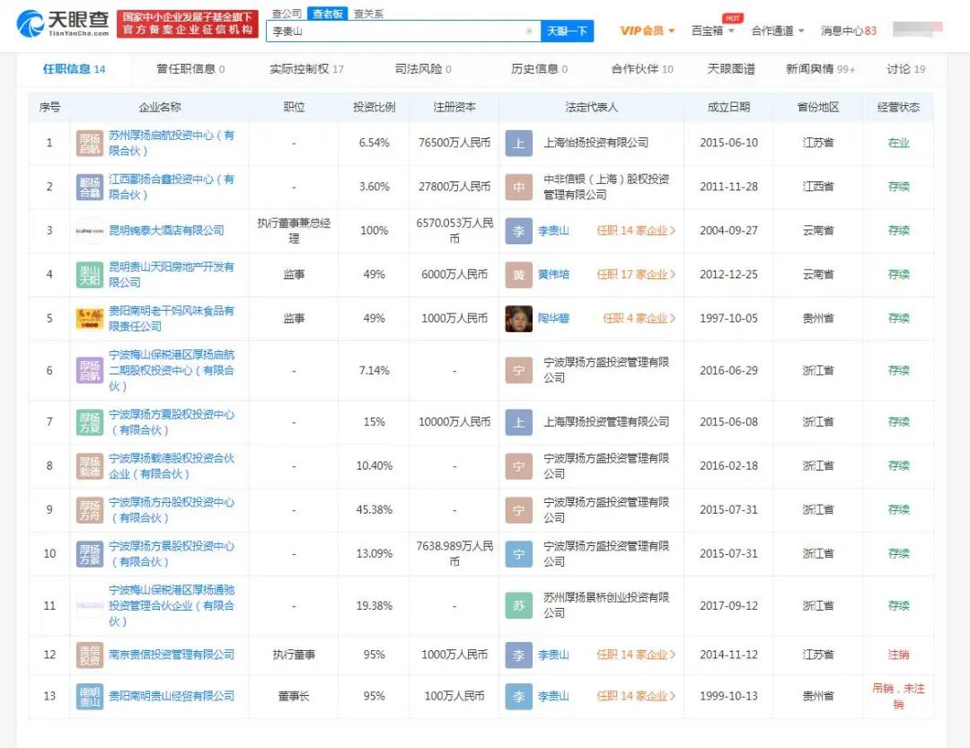12月29日,昆明桂山天阳房地产开发有限公司于11月4日追加限制高消费新订单。目前公司已连续19次被限制高消费,因未按时履行法定义务被法院强制执行6次,涉及金额约9757万元。股权渗透显示,“老干妈”陶华碧之子李桂山是公司最终受益人,持股比例为49%。